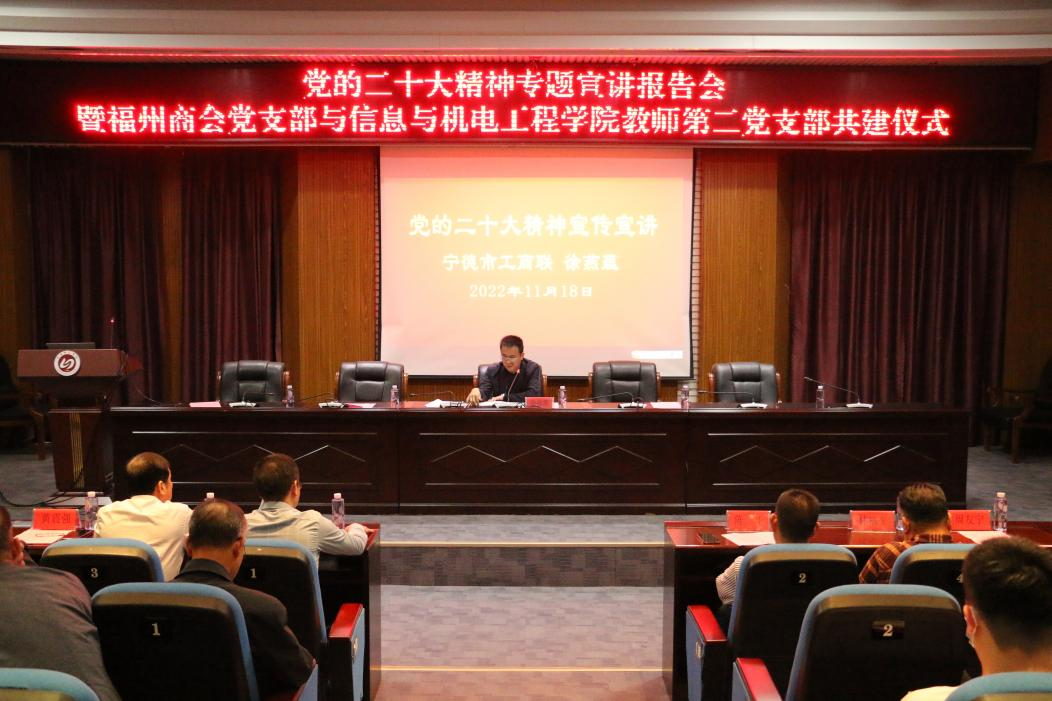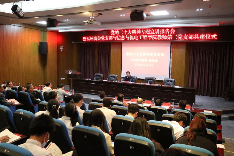 为深入学习宣传贯彻党的二十大精神,11月21日下午,宁德市委统战部副部长、市工商联党组书记、宁德市光彩事业促进会会长徐燕蕴为公司师生作党的二十大精神宣讲报告。会议由信息与公司党委书记陈茂和主持。