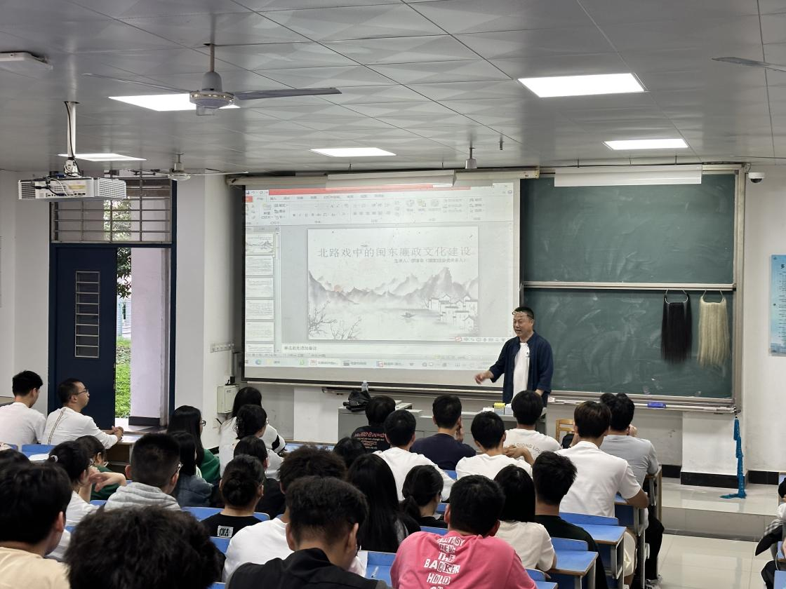 之后缪老师把北路戏的发展用故事化、戏曲化的方式展现给大家。他结合新编北路戏《下党故事》、《冯梦龙打虎》等剧目将戏曲四功中“唱、念、做、打”和五法“手、眼、身、法、步”与闽东传统廉政文化相结合展示给同学们。通过北路戏的演唱,把同学们带回当年的历史时空,身临其境,生动形象。最后,缪老师将自己追逐北路戏曲文化之路与同学们分享,指导同学们接触戏曲,感悟闽东的廉政文化精神内涵,引导同学们去接触属于闽东地区当下唯一的传统地方戏曲声腔剧种,展现了传统文化与现实碰撞的无限可能。