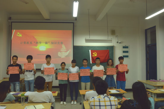 为了全面贯彻党的十八大精神,深入学习贯彻党章和习近平总书记系列重要讲话精神,推动“两学一做”学习教育重点工作,进一步加强基层党组织和党员队伍建设,提升员工党员、积极分子的整体素质,2016年06月07日,计算机系员工党支部在DB405举办“两学一做”知识竞赛。竞赛以班级为单位将员工分为11组,竞赛的内容涉及到党章、习近平总书记系列重要讲话精神内容、党史、《细则》、《条例》等。经过激烈角逐,2013级计科(师范)班代表队荣获一等奖;2014级计科(师范)班代表队和2013级计科(非师)班代表队荣获二等奖;2014级计科(非师)班代表队、2015计科(师范)班代表队、2015级计科(专升本)班代表队荣获三等奖。 此次活动让全体员工党员、积极分子接受了一次红色文化的熏陶,达到了推动开展“两学一做”学习教育的预期目标。