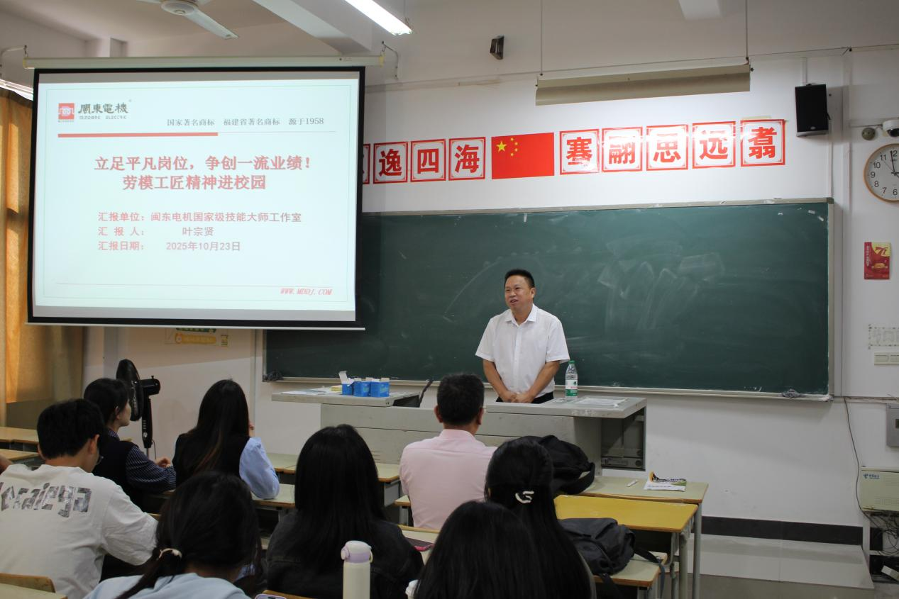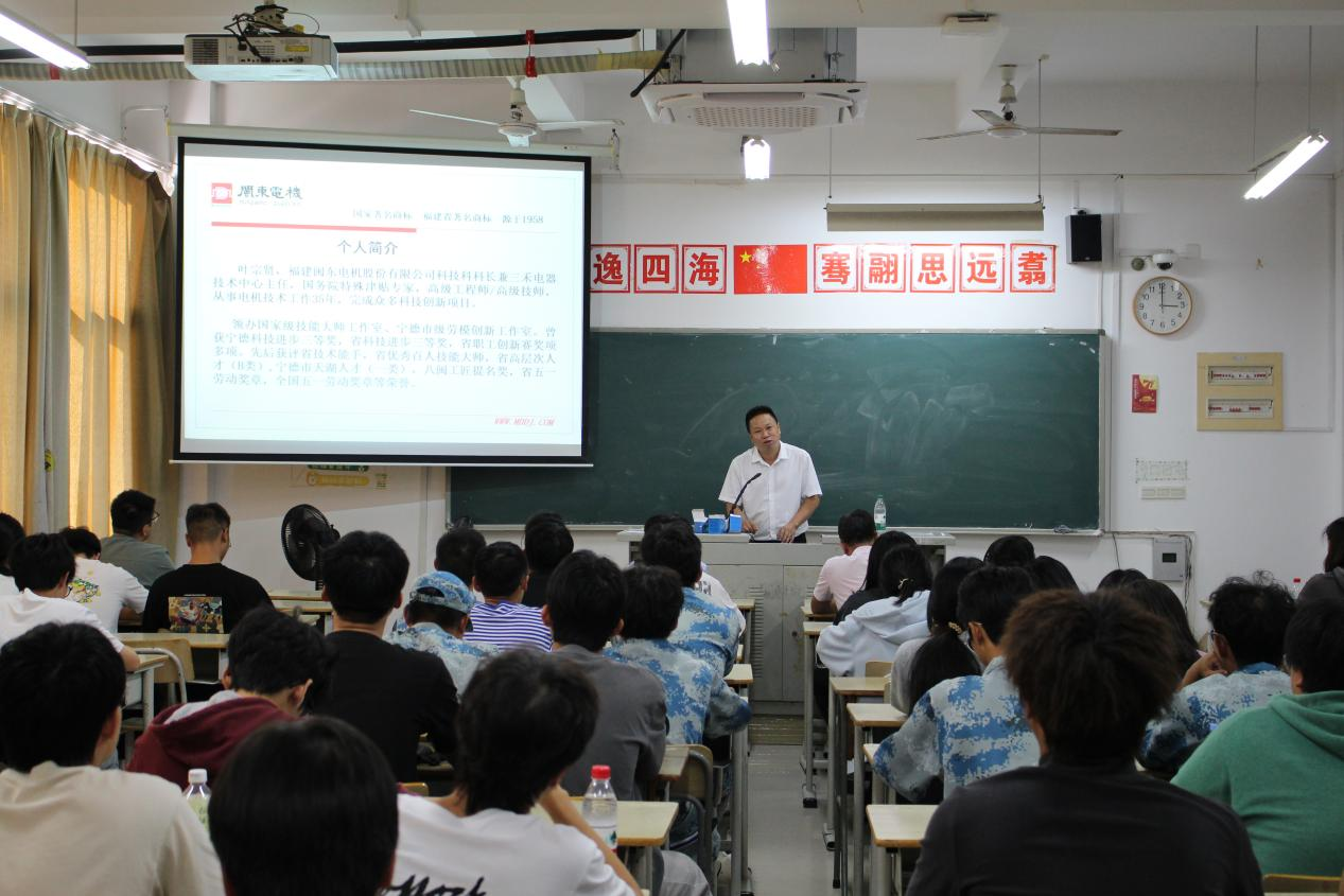 叶宗贤高工结合自身在闽东电机30余年的技术工作历程,用朴实无华的语言、生动鲜活的事例,分享了如何在基层岗位上发现问题、解决问题,如何在实践中不断学习、不断突破自我。讲述了自己从一名普通技术工人,凭借着对电机技术的执着追求和不懈努力,逐步成长为国务院政府特殊津贴专家、全国五一劳动奖章获得者,并领衔创办了国家级技能大师工作室的故事。他强调,无论身处何种行业、哪个岗位,都要有扎根实践、埋头苦干的决心,要有持续学习、不断创新的意识,更要有追求卓越、勇创一流的志向。他勉励同学们要珍惜在校时光,扎实学好专业知识,同时注重培养吃苦耐劳、严谨专注的职业素养,为将来服务社会、建功立业打下坚实基础。他的分享情真意切,感人至深,现场掌声阵阵,同学们深受启发和鼓舞。