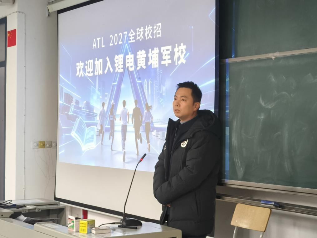 随后,宁德新能源科技有限公司(ATL)全球招聘高级经理计文江带来专题分享,从企业视角为学子们勾勒发展蓝图。他系统梳理了企业从创立之初深耕聚合物软包电池领域,到成长为全球新能源创新技术龙头的发展历程,详细介绍了公司主流电池产品的应用场景与技术优势。结合产学班培养模式,他重点说明,该班采用“3+1”分段培养机制,通过企业定制课程、一线导师授课、全真岗位实操等方式,实现理论学习与生产实践的深度融合,助力学子们“毕业即就业、上岗即胜任”。